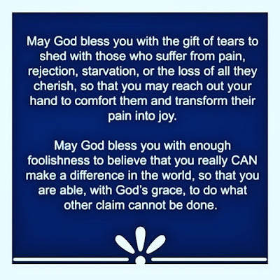 May God bless you with the gift of tears to shed with those who suffer from pain, rejection, starvation, or the loss of all they cherish, so that you may reach out your hand to comfort them and transform their pain into joy.